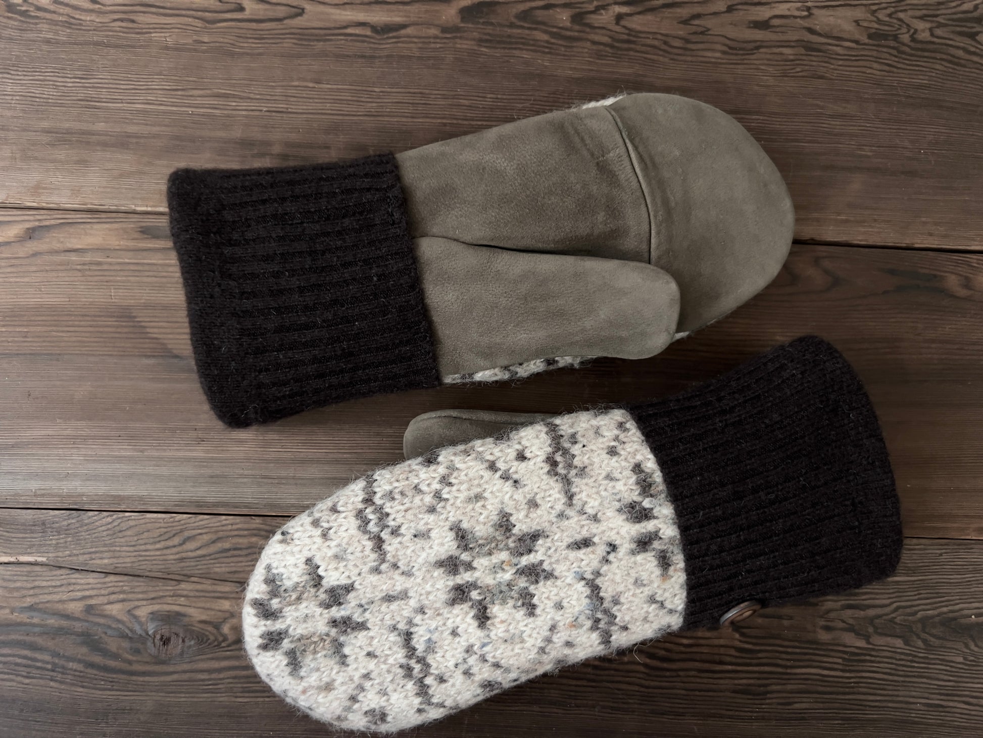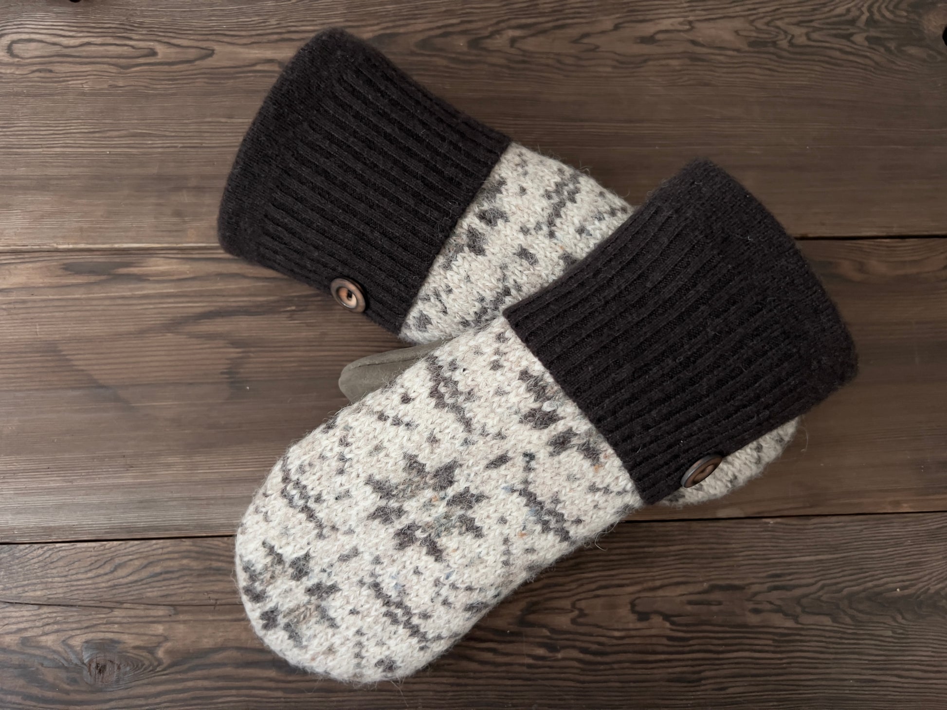 Handmade from reclaimed leather and wool. Cream patterned and brown wool with a tan nu buck leather palm and a burnt wood button detail.