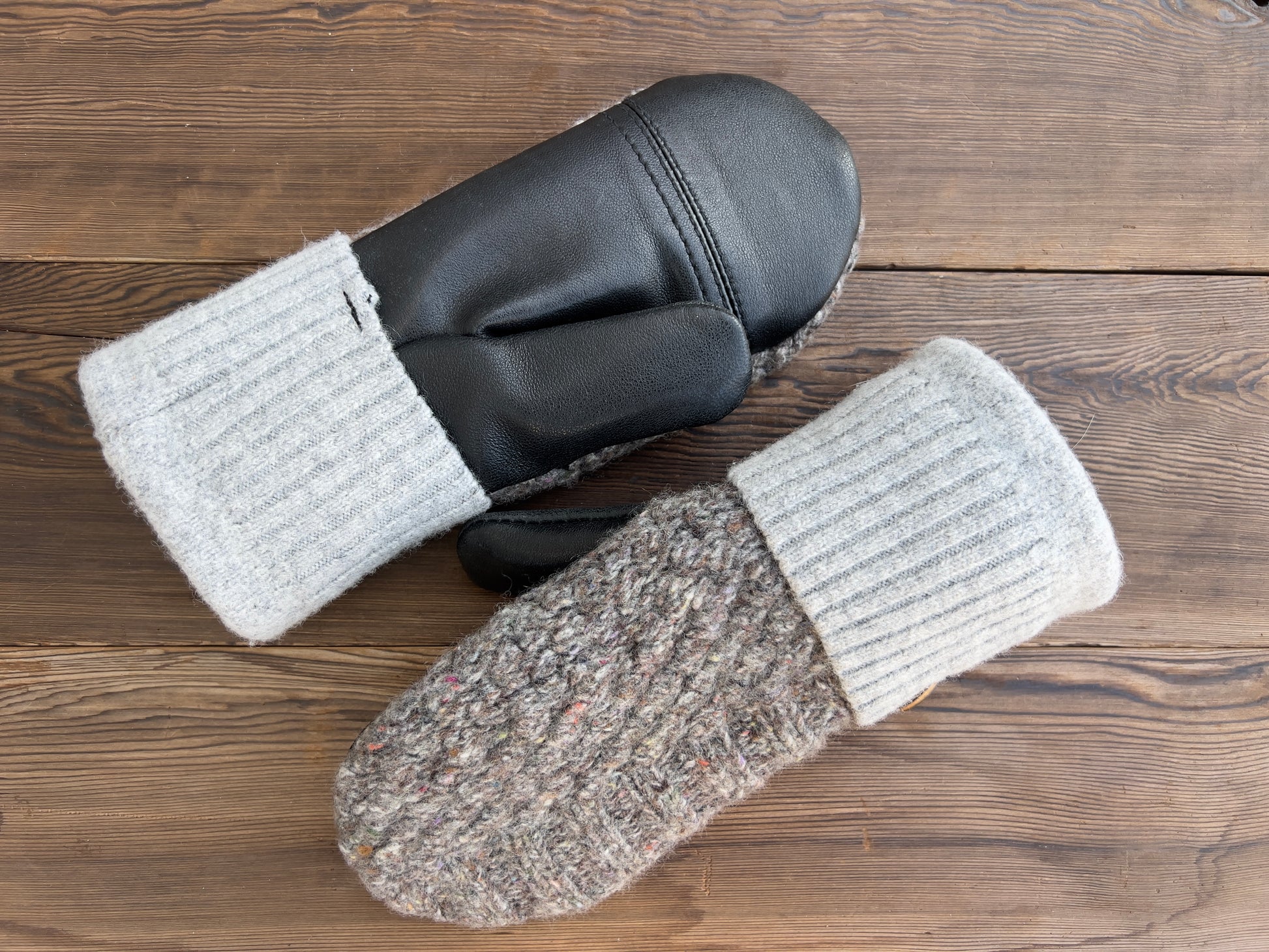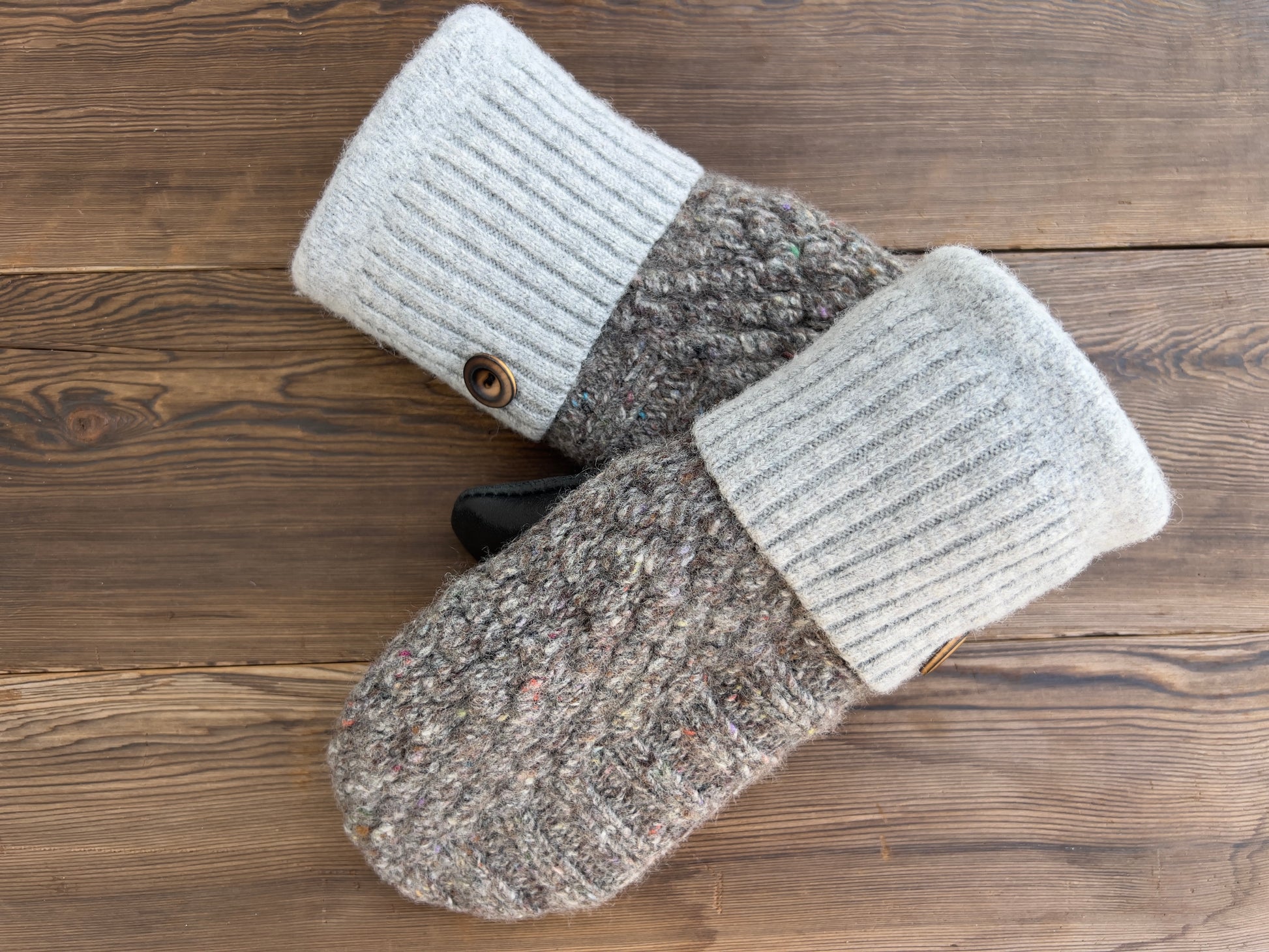 Handmade from reclaimed leather and wool. Soft tan cashmere cable knit with a grey cuff, black leather palm and a burnt wood button detail.