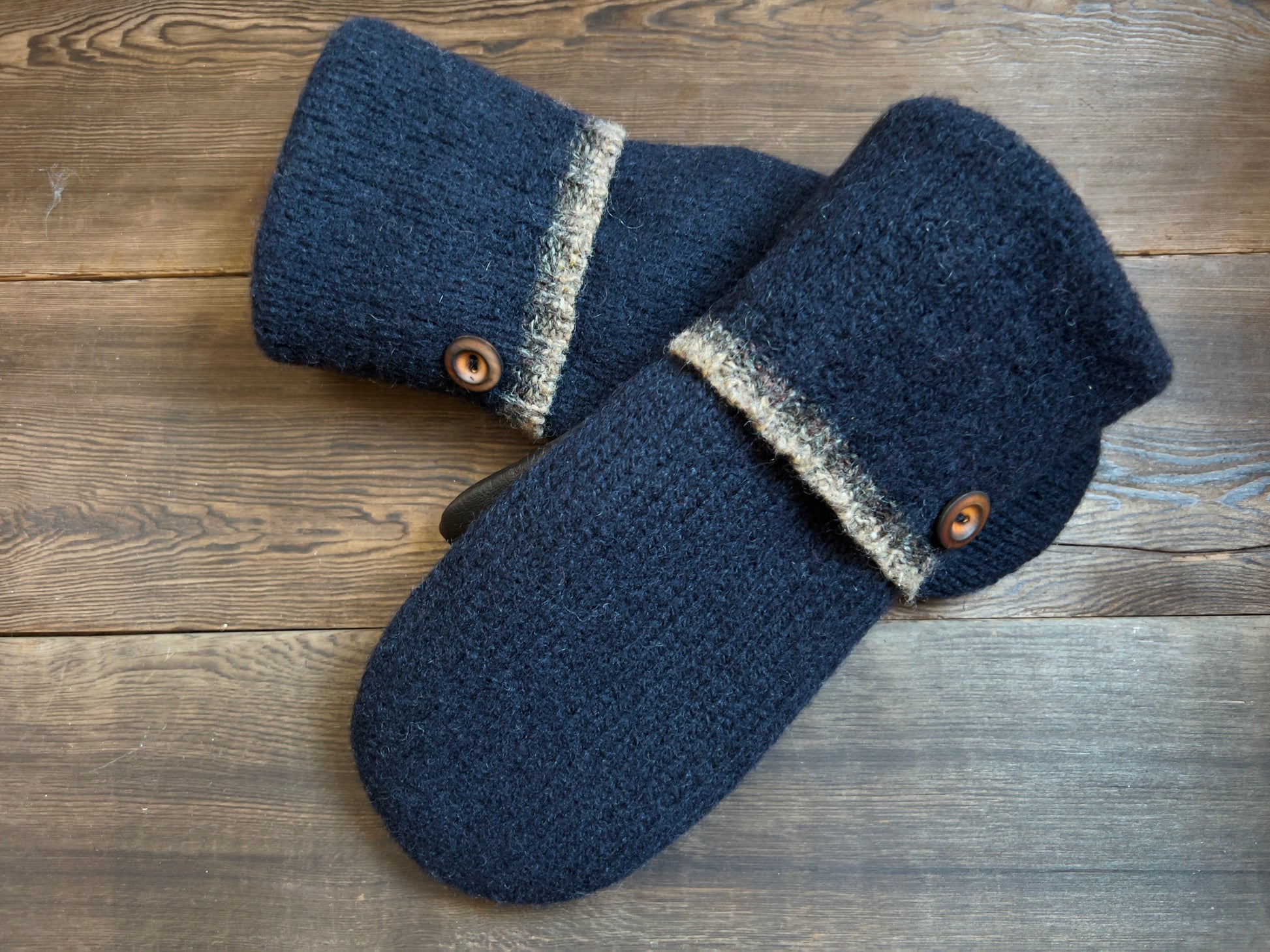 All my mittens are handmade from reclaimed wool and leather. They are lined with a heavy weight technical fleece to keep you warm. I have designed this is a fitted mitten that will naturally stretch and form to your hands with wear. Currently, mittens posted here are a standard size which fits most (small/medium hands). Measurements are approx 9.5 inches long from tip of mitten to bottom of the cuff and 4.25 inches wide. Fits fingers up to 5 inches long (measured from the fold of your thumb and index finger.) Variations in leather and wool are normal as they are handmade from reclaimed wool and leather garments.